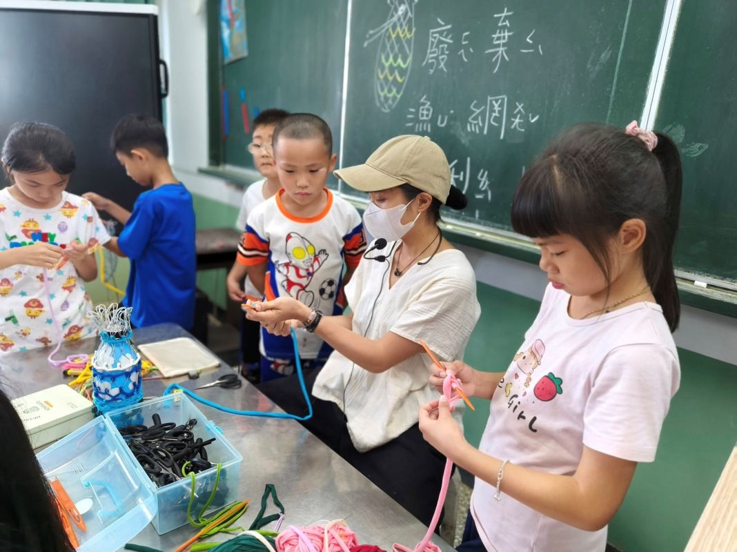 ▲學習海島老手藝-將廢棄漁網編織成日常的背袋,讓孩子學會漁網的新用途與減塑生活。